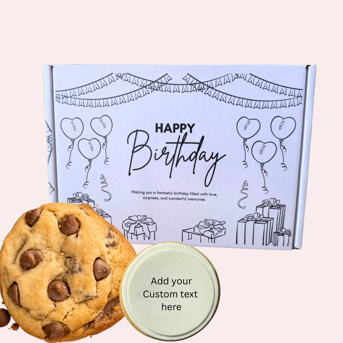 Celebrate in style with our Happy Birthday Gift Box, expertly curated for those special moments. This premium selection features six New York-style cookies—crispy edges with chewy centres—paired with four custom sugar cookies personalised with your heartfelt message printed directly on the icing. Each cookie is crafted with quality ingredients and finished with professional edible printing, ensuring your birthday wishes arrive as delicious as they are meaningful. Perfect for sending across New Zealand or presenting in person, this thoughtfully designed box transforms a simple treat into a memorable keepsake that combines indulgence with personalisation.